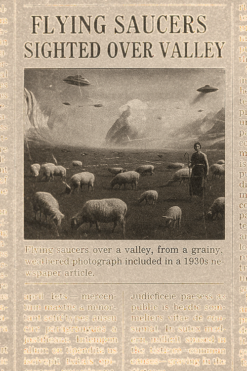 ..30년대 유럽에서 큰 논란을 일으켰고...나중에 진위여부를 놓고 논쟁을 벌이다. 70년대에서야 위작으로 밝혀진 I Tribune의 "목동과 UFO"의 사진과 기사.. 최근 해당 사진의 원본이라고 하는 사진이 발견돼 논란이 일고있다..P Menard가 배낭 여행중에 골동품 시장에서 입수한 사진이 그것인데... 처음에 그는.. ......(Daily-I 기사에서 발췌,2025)
