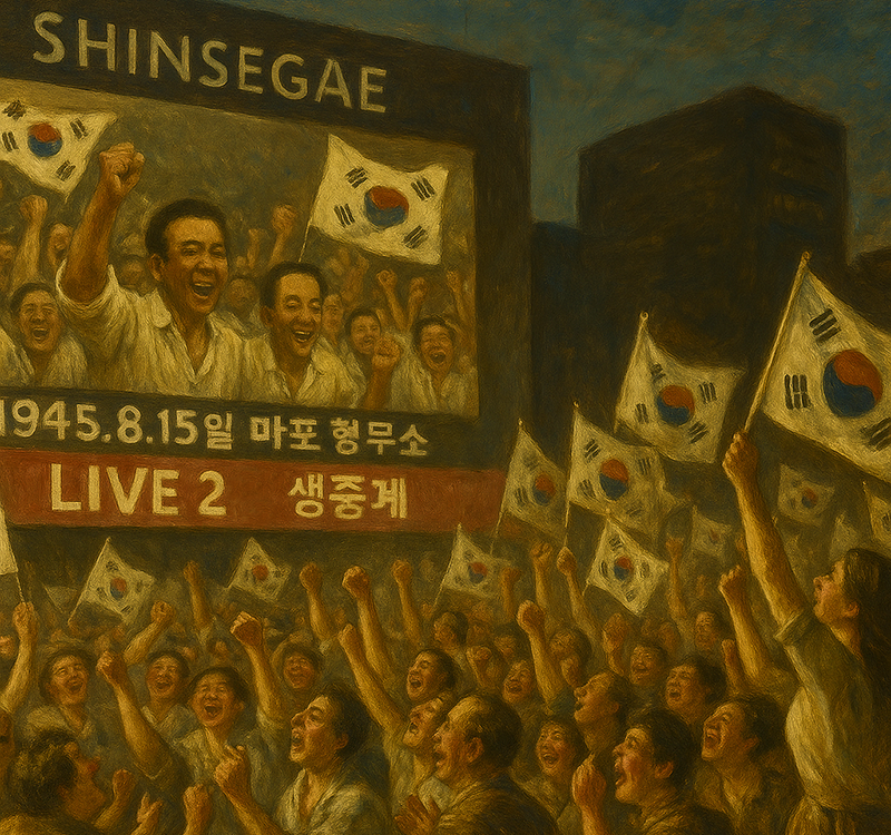 1945년 현장과 연결되어 벌어지는 2원 생방송 중계장면의 모습을 사실주의 화가 쿠르베가 담았다.