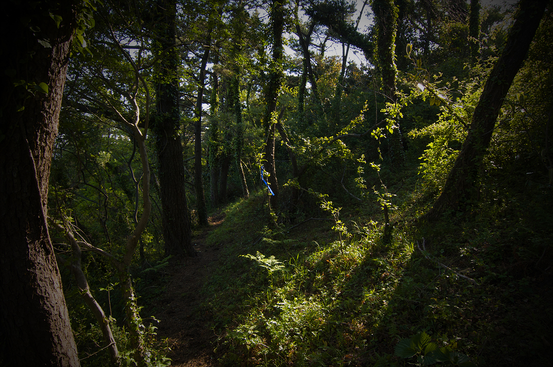 월라봉을 오르며..(길안내를 하는 올레 리본이 나뭇가지 사이에 매어있다..)