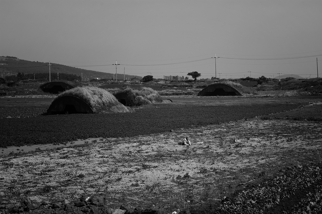 격납고 그리고 무성한 풀과 밭이 어두운 과거와 현재의 묘한 조화를 만들어내고 있고..