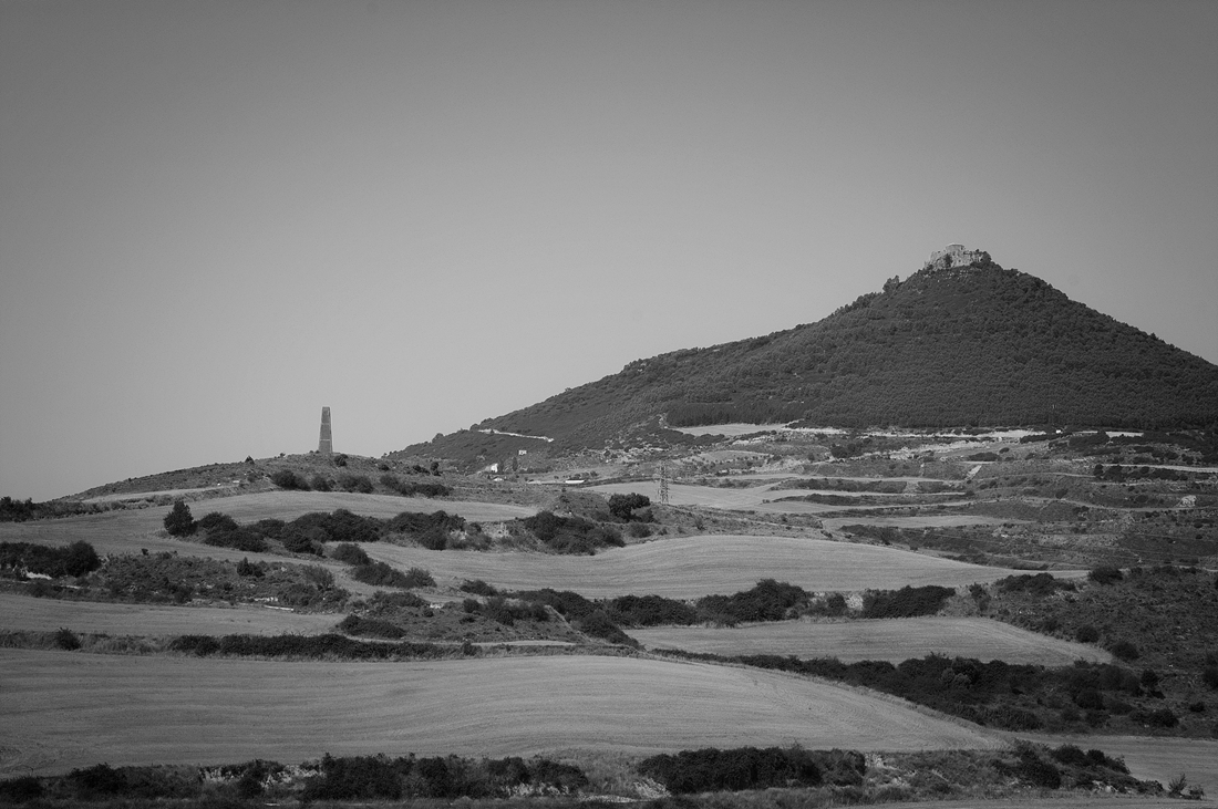 몬하르딘 성과, 앞의 뾰족한 탑은 몬테주라 기념비(Montejurra Memorial)라고 한다.