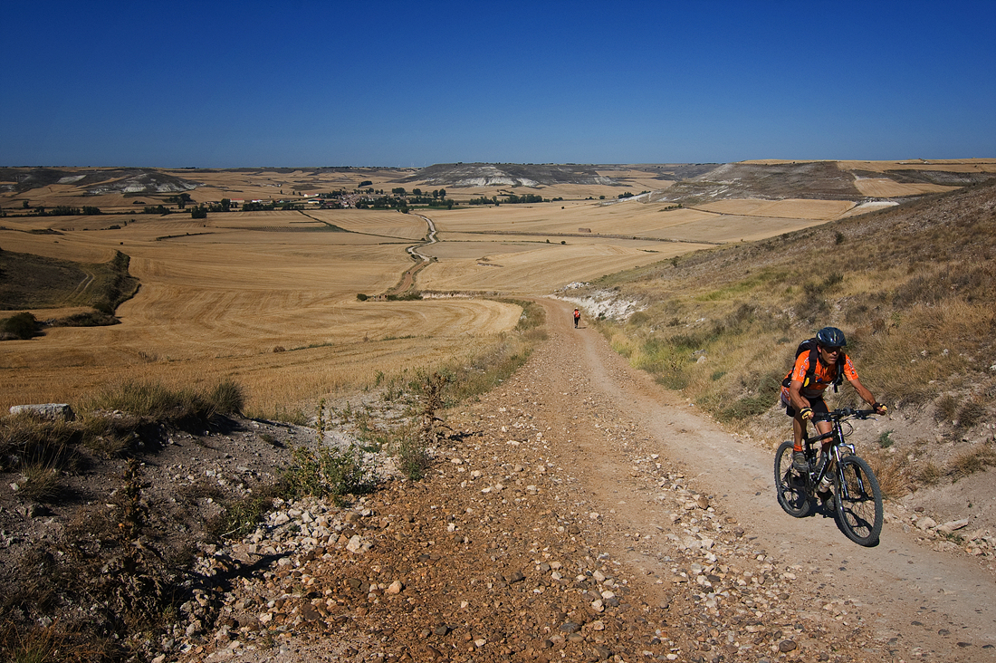오르막길을 힘겹게 오르는 바이커 순례자..
