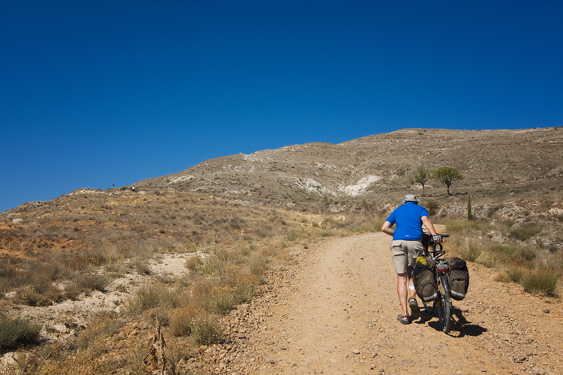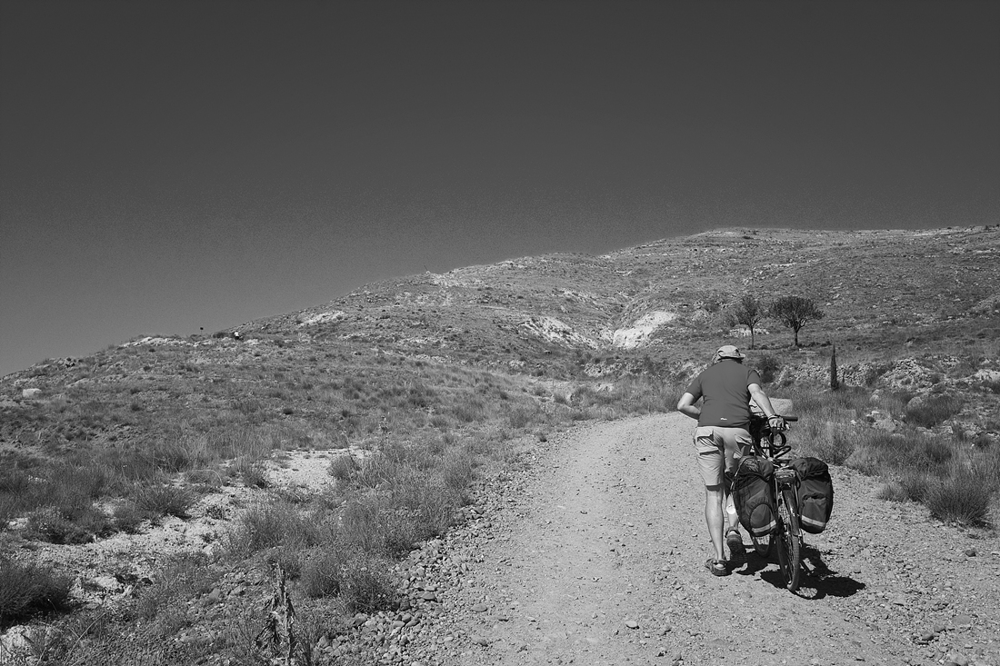 * 한 바이커 순례자가 자신의 자전거(투어링 바이크인듯..)를 끌고 힙겹게 오르고있다.